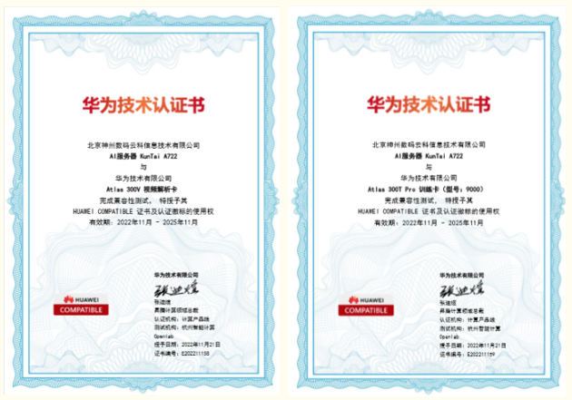 近日,神州 A722服务器通过华为“Atlas 300V 视频解析卡”以及“Atlas 300T Pro 训练卡(型号:9000)”两项技术认证,为智能算力再添新力!